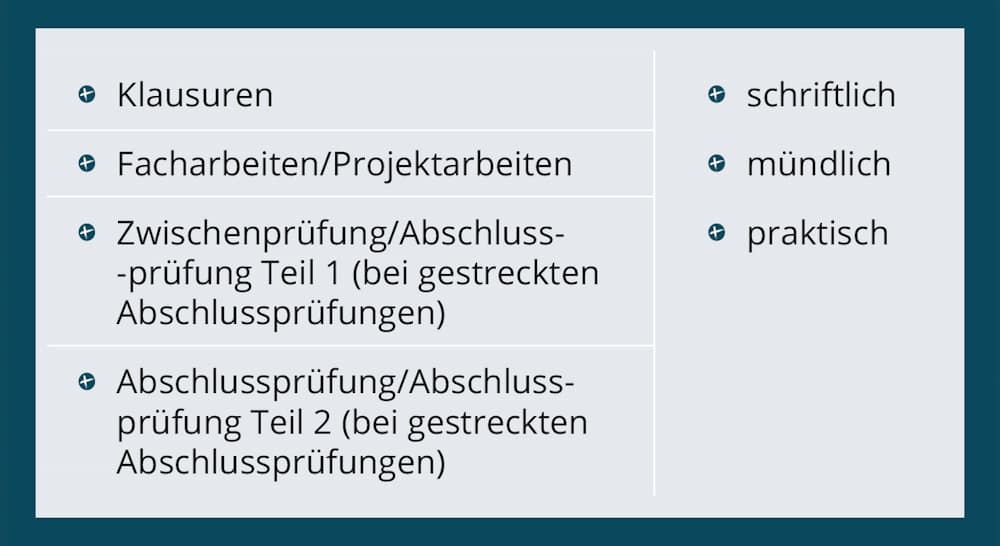 In der Regel werden Ihre Azubis von der Berufsschule bzw. von der Kammer (bei Abschlussprüfungen) zu anstehenden Prüfungen informiert. Diese Infos geben Ihre Azubis dann an Sie als Ausbilderin bzw. Ausbilder weiter. So sind Sie ebenfalls informiert, was auf Ihre Azubis zukommt – und können bei offenen Punkten nachhaken. Vorteil: Je besser Ihre Azubis wissen, was genau sie erwartet, je gezielter können sie sich vorbereiteten und je sicherer werden sie sich dadurch fühlen.